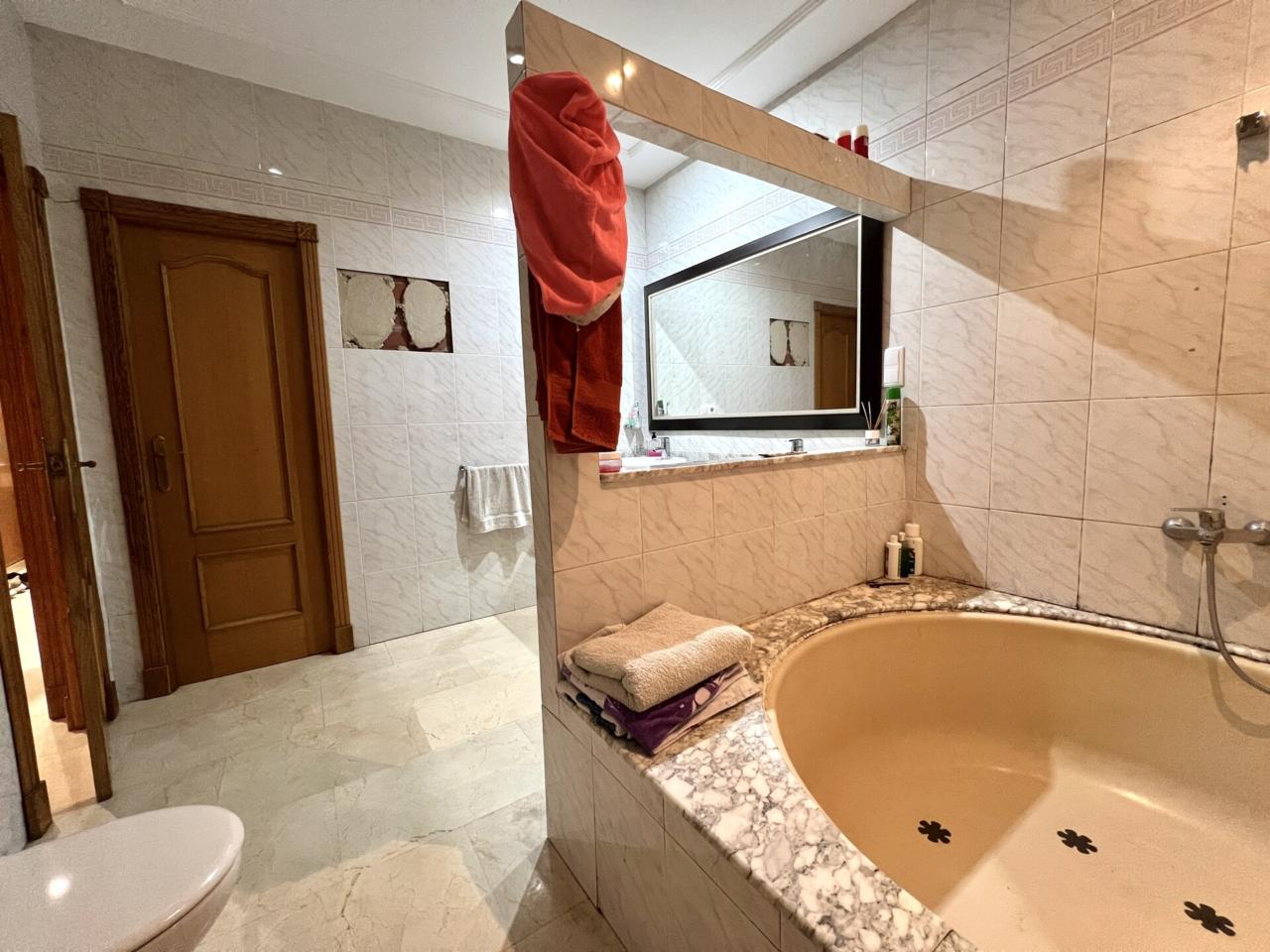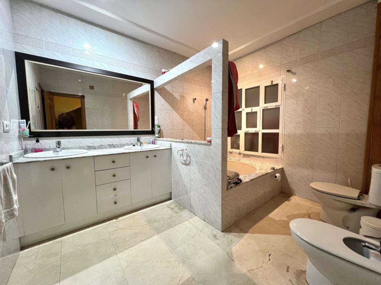 La primera planta dispone de cuatro habitaciones. Destaca la habitación principal por su amplitud, gran capacidad de armariado y ventanas a la calle que le proporcionan mucha luz natural. En esta planta también hay un baño amplio, equipado con doble lavabo y bañera.