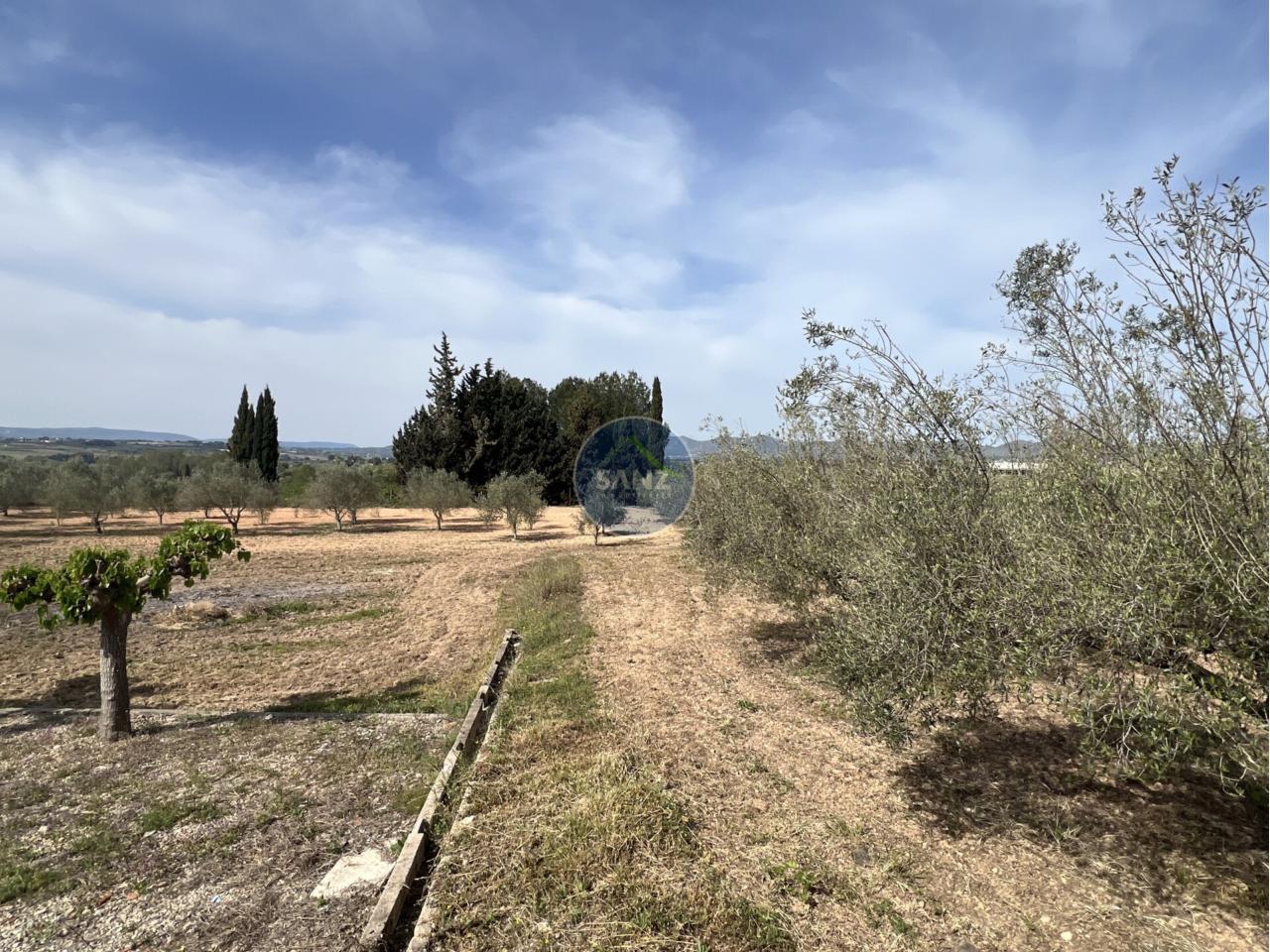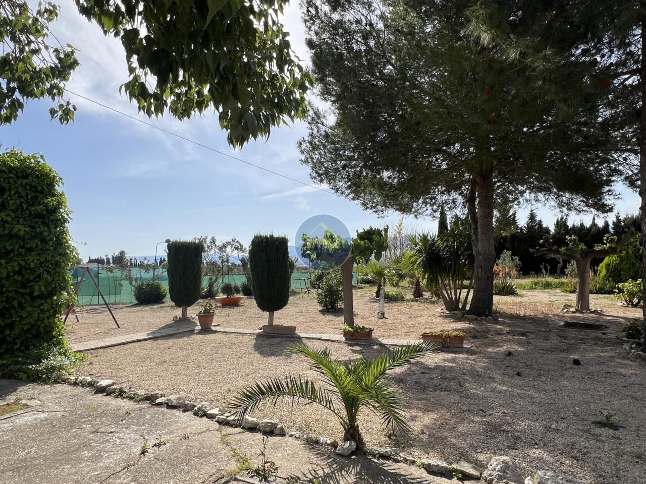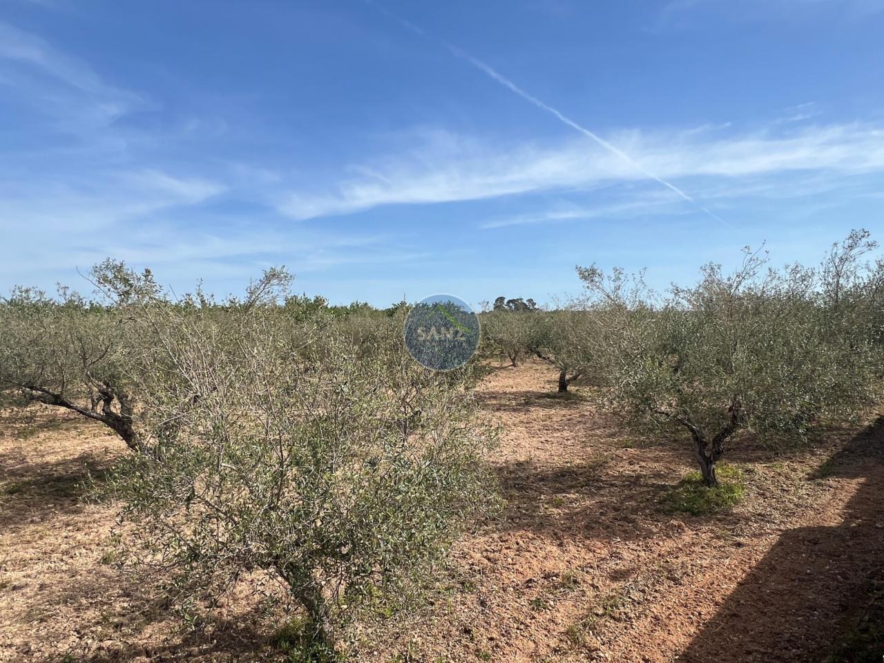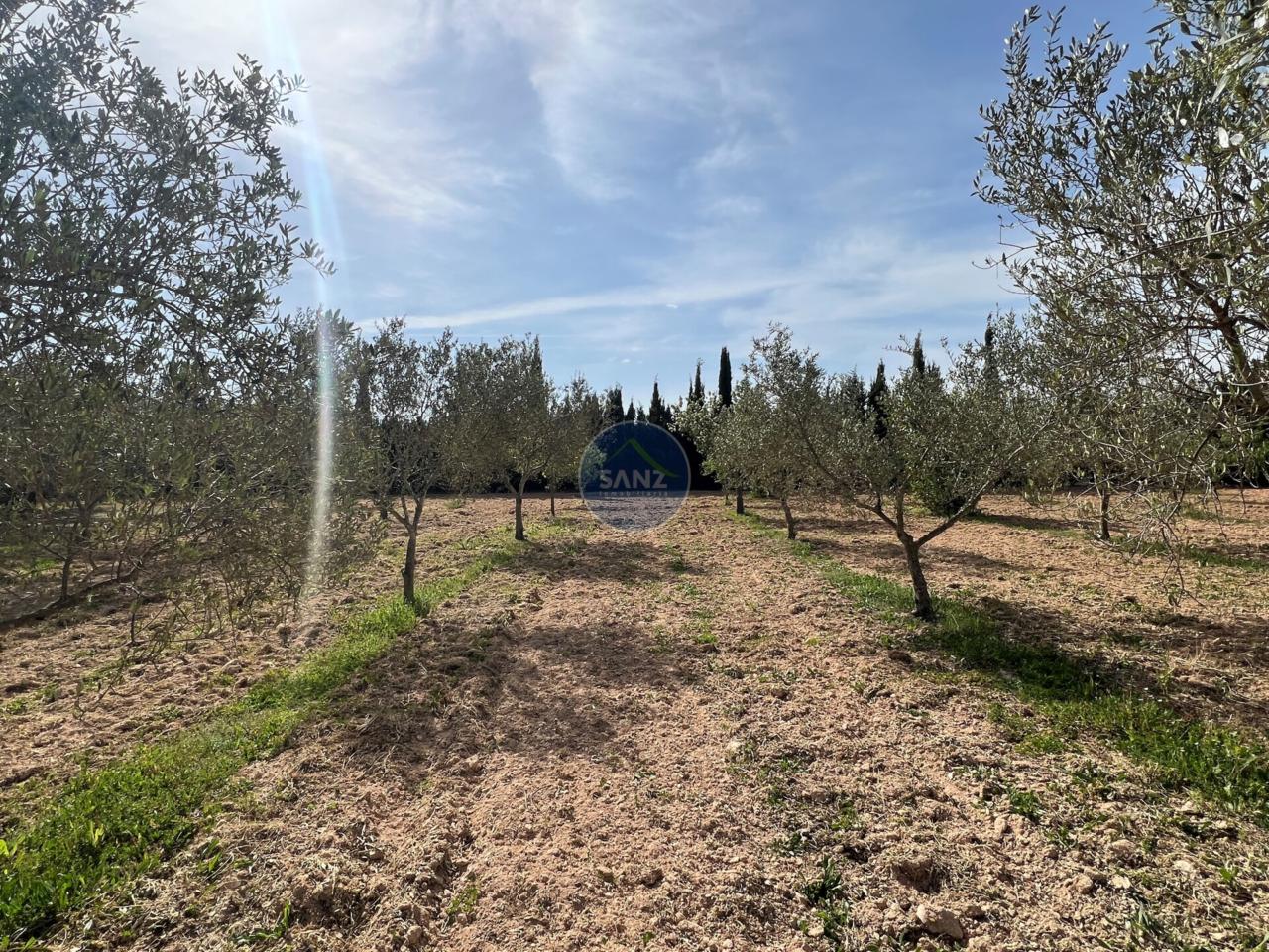 La parcela combina una zona ajardinada cuidada con el resto del terreno plantado de olivos, aportando privacidad y entorno natural.